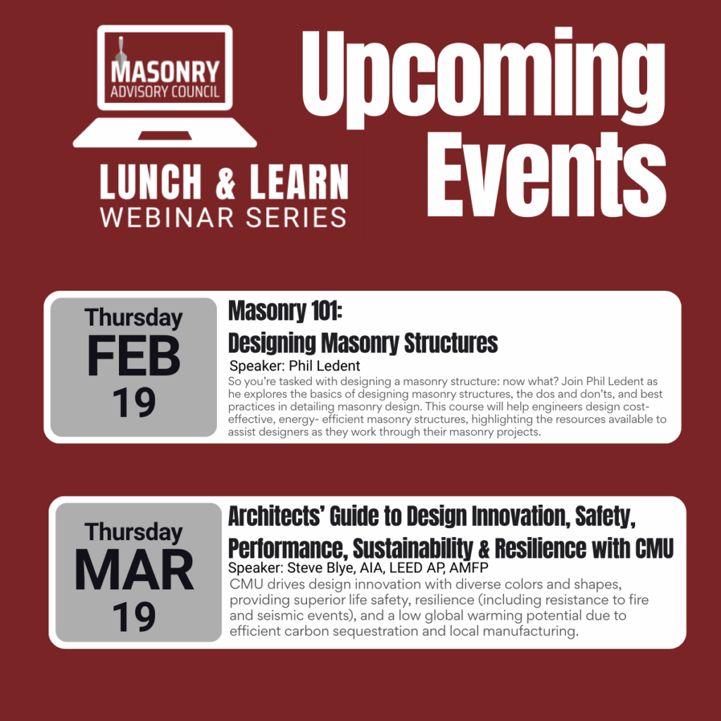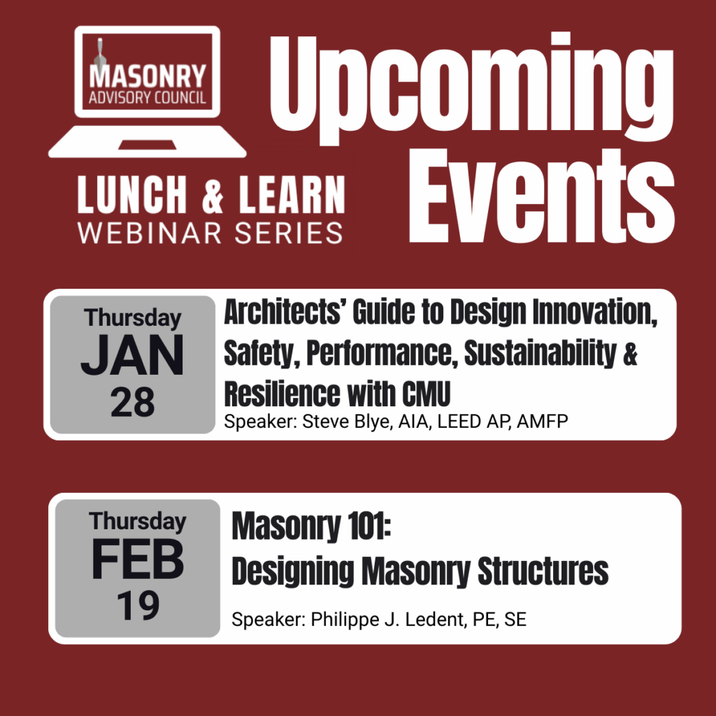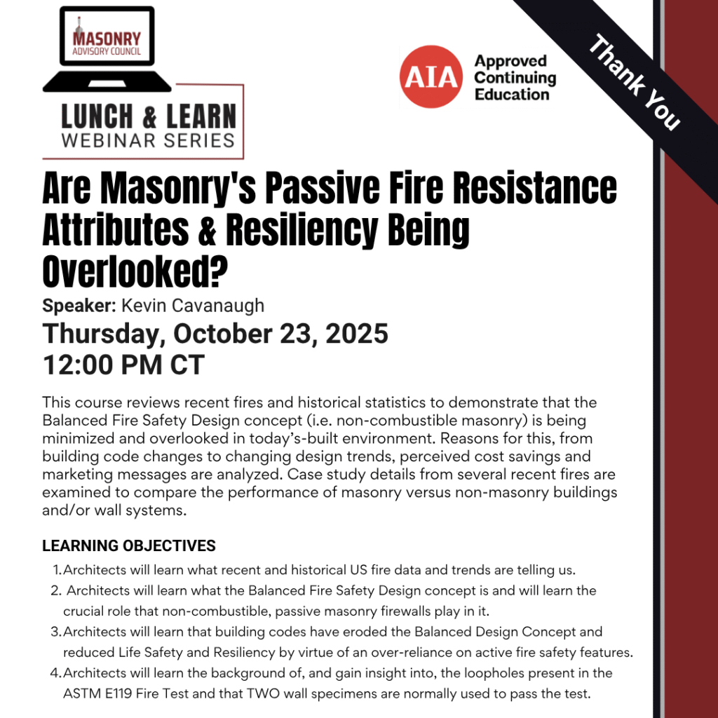 The Masonry Advisory Council is proud to offer these informative Continuing Education presentations by professionals in masonry design, construction, and materials. MAC provides these webinars FREE to Architects, Engineers, Contractors, and Developers in the Chicagoland and NW Indiana area. You’ll receive AIA credit or PDH certification for each presentation.